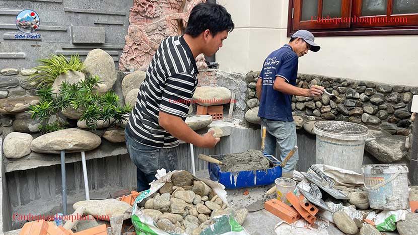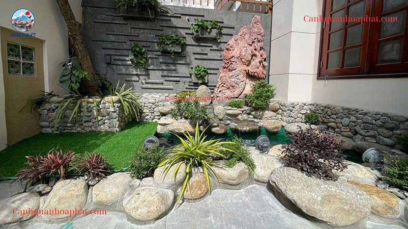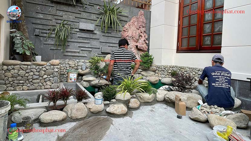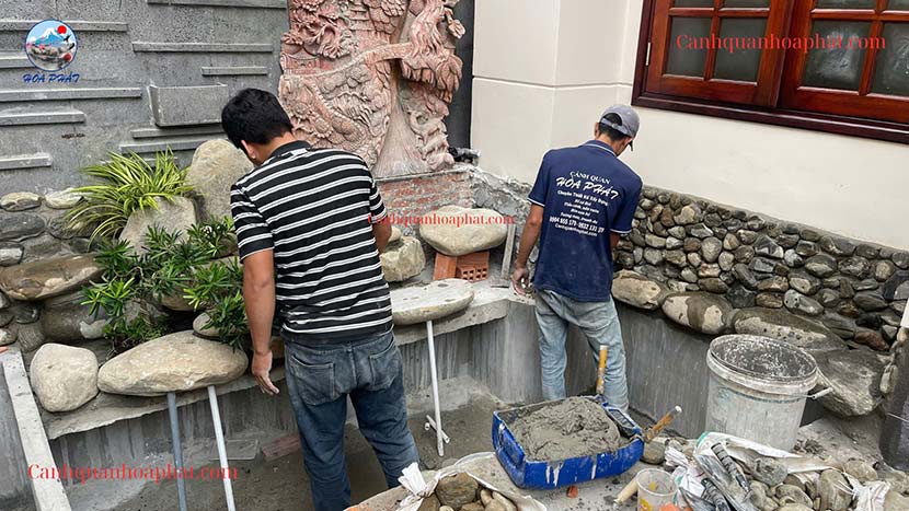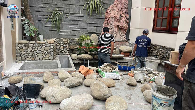 Hòn non bộ được thi công từ đá cuội vân mây chọn lọc, sắp xếp theo bố cục: