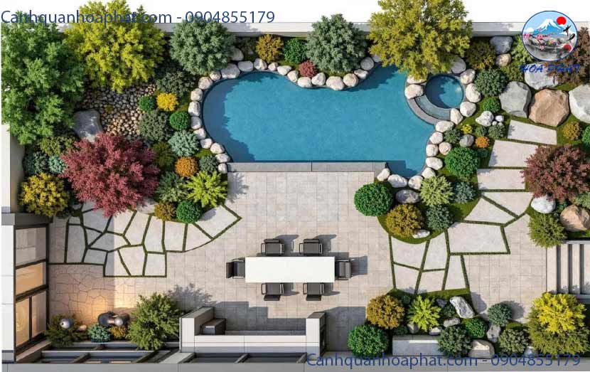 Cảnh quan được thiết kế hợp lý sẽ giúp giảm rác rơi xuống hồ, tạo bóng mát, điều hòa nhiệt độ nước và mang lại cảm giác thư giãn đúng nghĩa cho gia chủ.